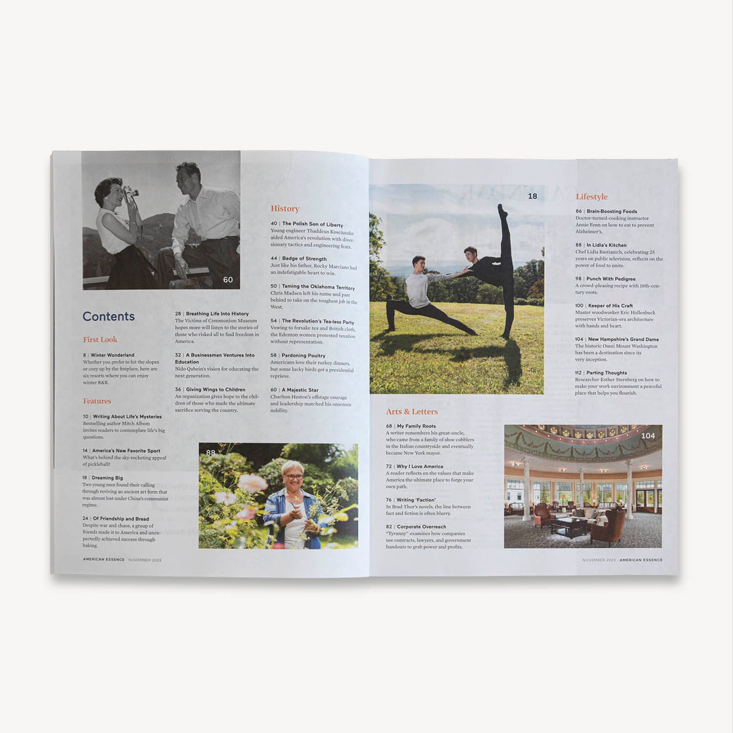 American Essence is a monthly magazine with stories about the people, places, and influences that embody the ideals and virtues that formed America. It celebrates the everyday individuals who grow our food, start small businesses, raise families, build communities, and preserve traditional culture for generations to come—the heart and soul of America.