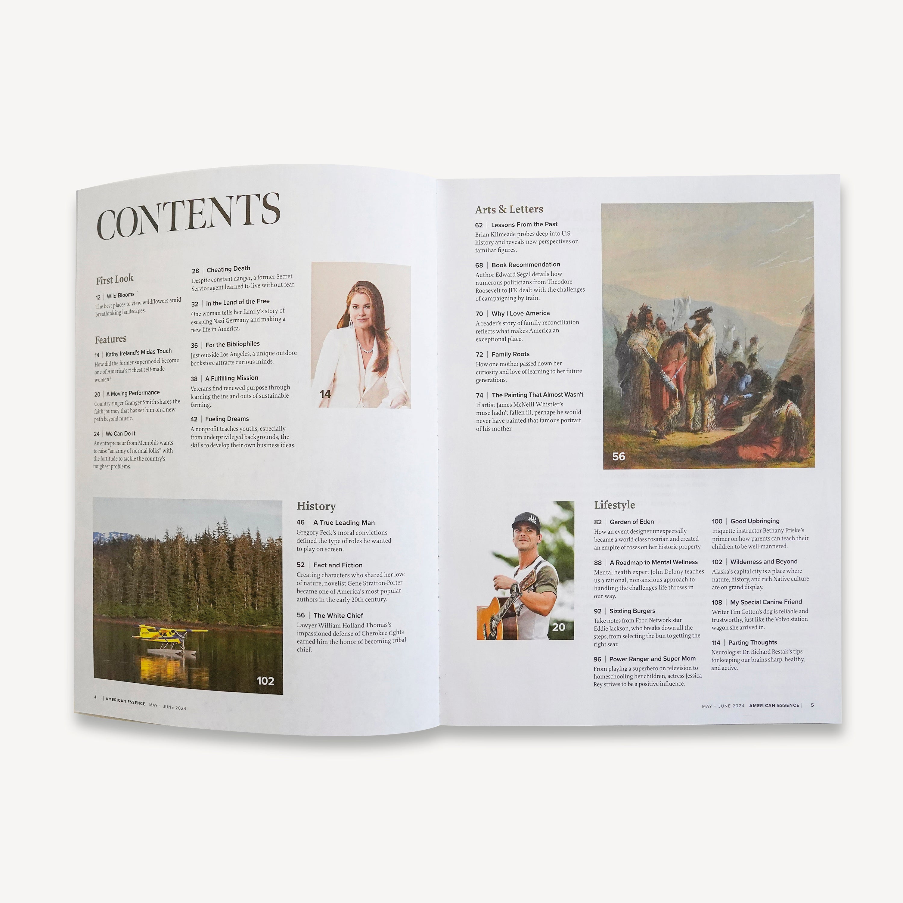 American Essence is a Bi-monthly magazine with stories about the people, places, and influences that embody the ideals and virtues that formed America. It celebrates the everyday individuals who grow our food, start small businesses, raise families, build communities, and preserve traditional culture for generations to come—the heart and soul of America.