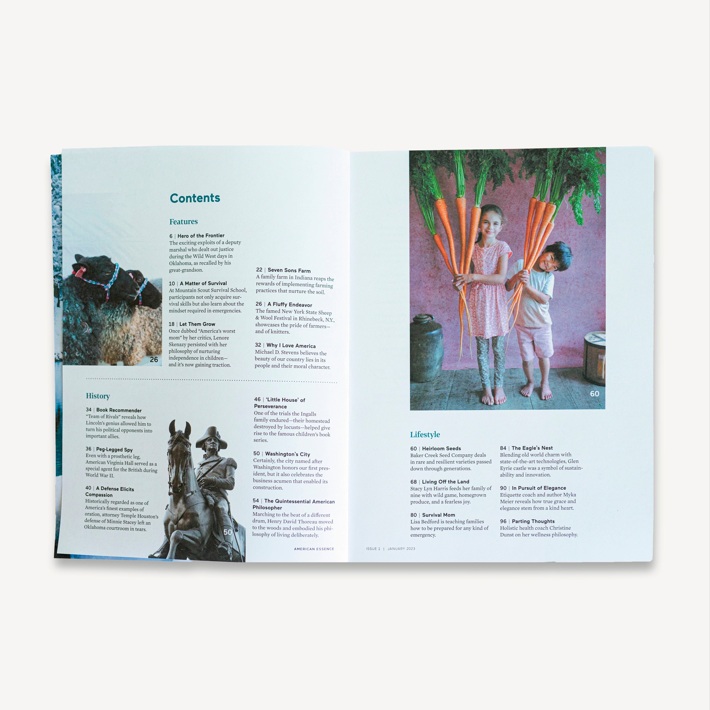 American Essence is a monthly magazine with stories about the people, places, and influences that embody the ideals and virtues that formed America. It celebrates the everyday individuals who grow our food, start small businesses, raise families, build communities, and preserve traditional culture for generations to come—the heart and soul of America.