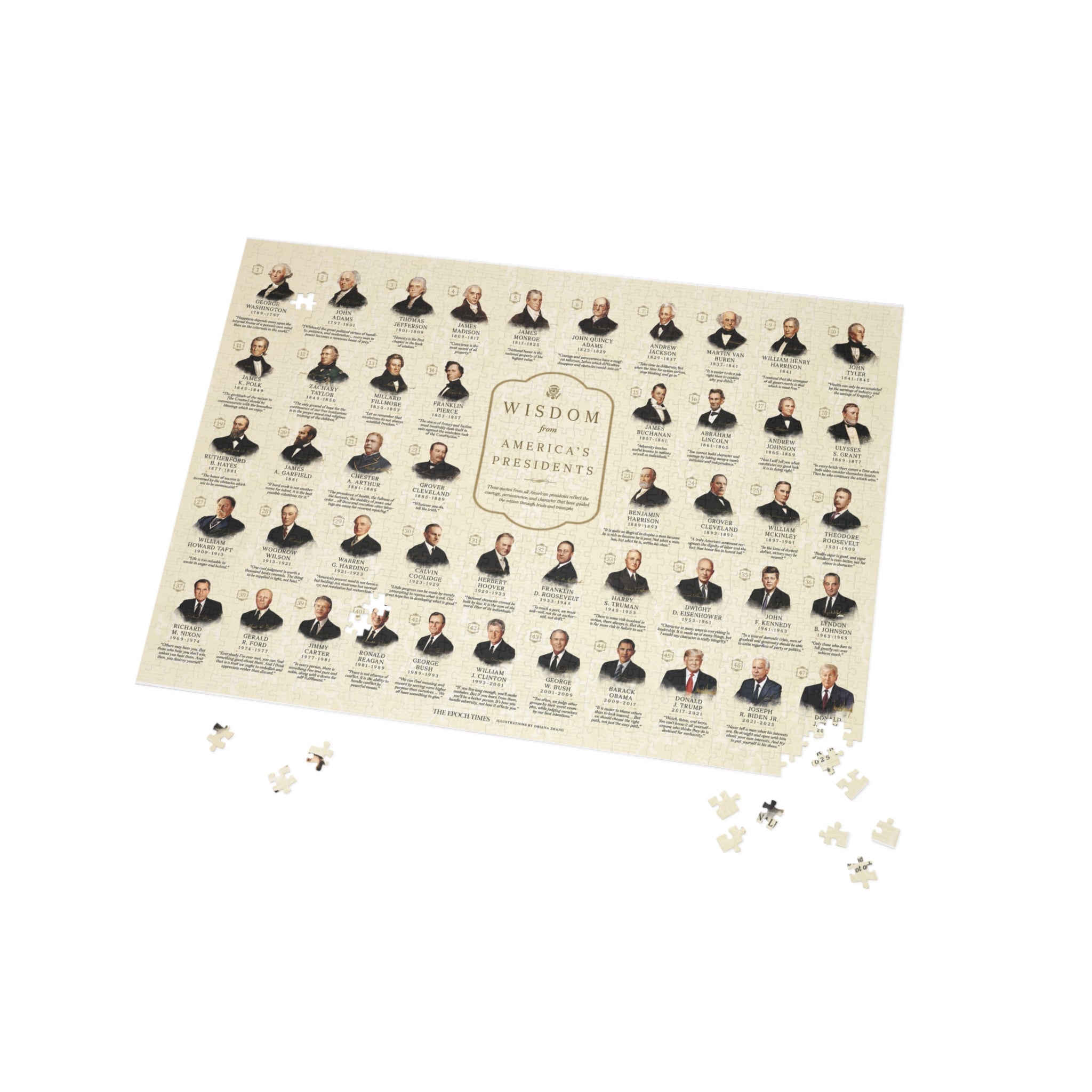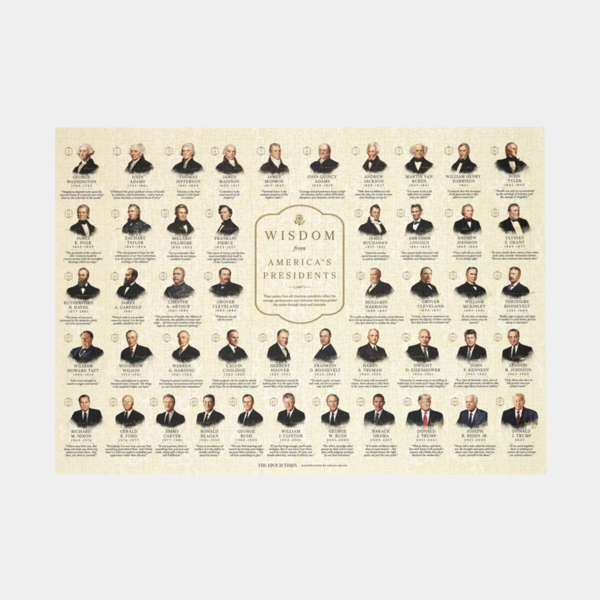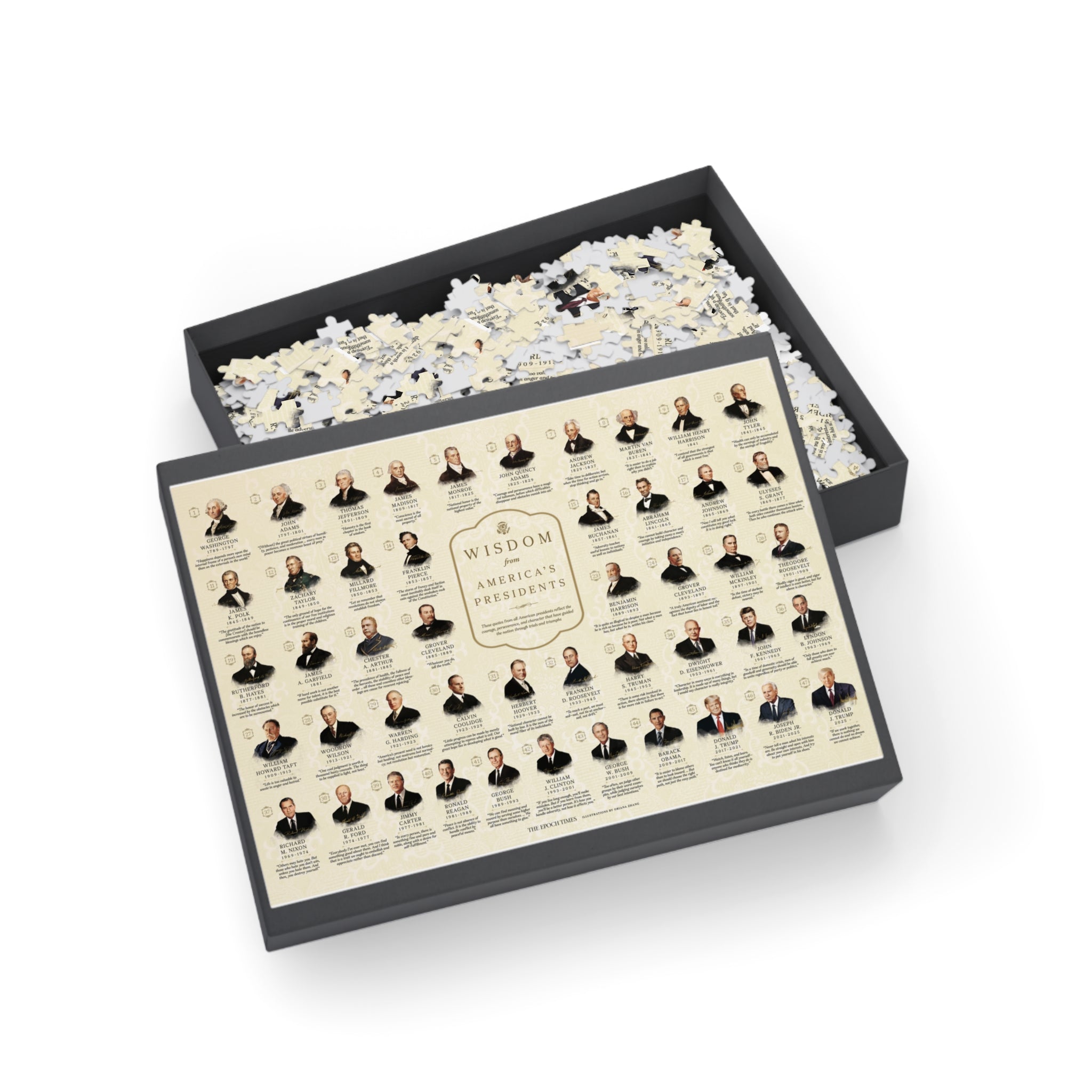 Celebrate the legacy of American leadership with the Wisdom From America’s Presidents Puzzle. Featuring 47 presidents and their timeless words of courage, perseverance, and character, this 1,000-piece puzzle invites you to reflect and relax. With premium materials and a glossy finish, it’s as rewarding to assemble as it is to display. Start your journey through history—one piece at a time.